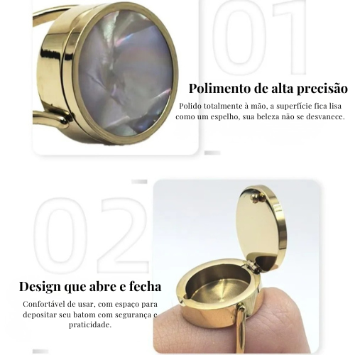 O Anel Beauty Capsule foi criado para mulheres que amam praticidade sem abrir mão do estilo. Seu design inteligente com abertura permite armazenar batom, balm labial ou lip tint, mantendo seus lábios hidratados e bonitos em qualquer momento do dia — diretamente no seu dedo.